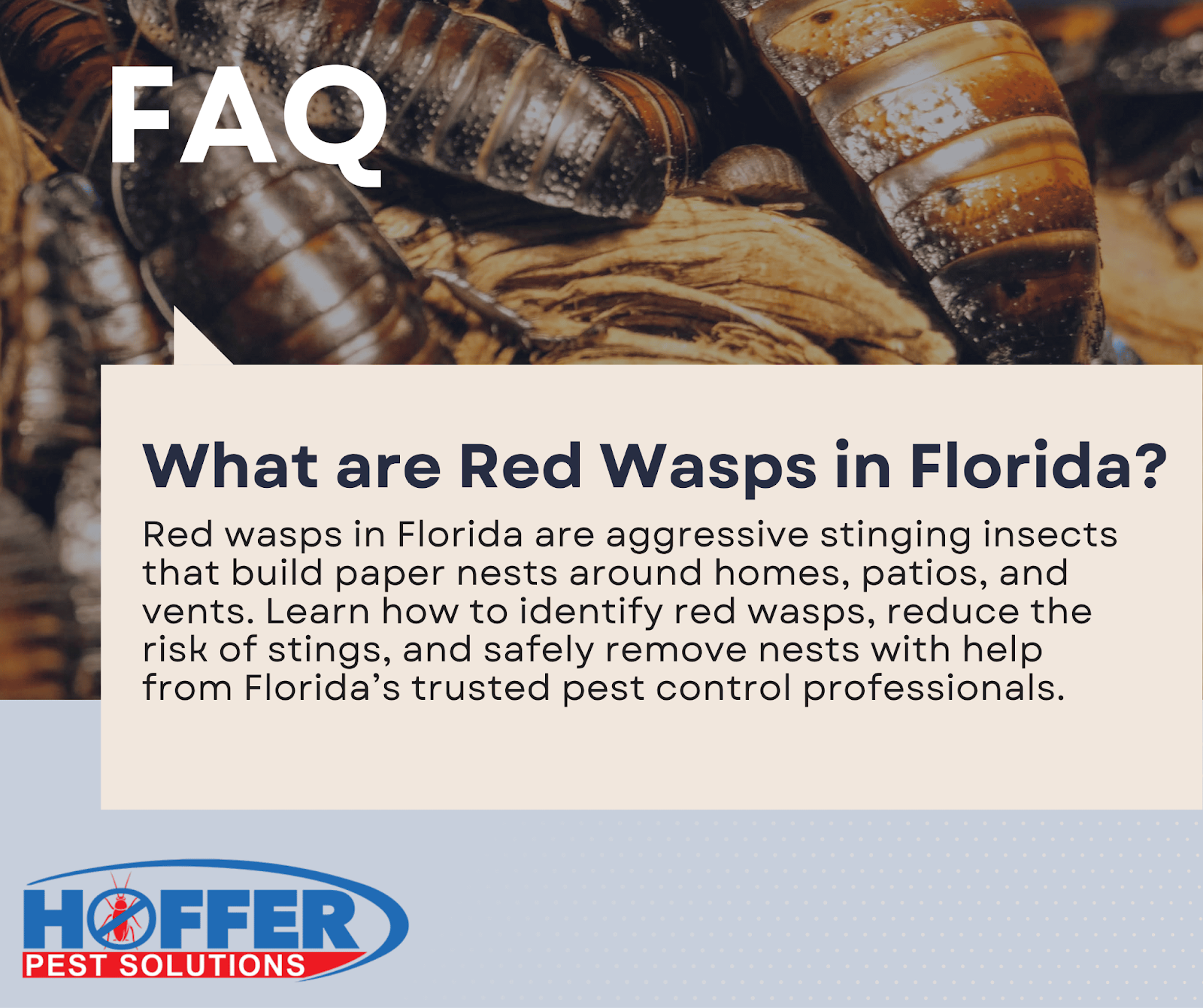 Red wasps in Florida are aggressive stinging insects that build paper nests around homes, patios, and vents. Learn how to identify red wasps, reduce the risk of stings, and safely remove nests with help from Florida’s trusted pest control professionals.