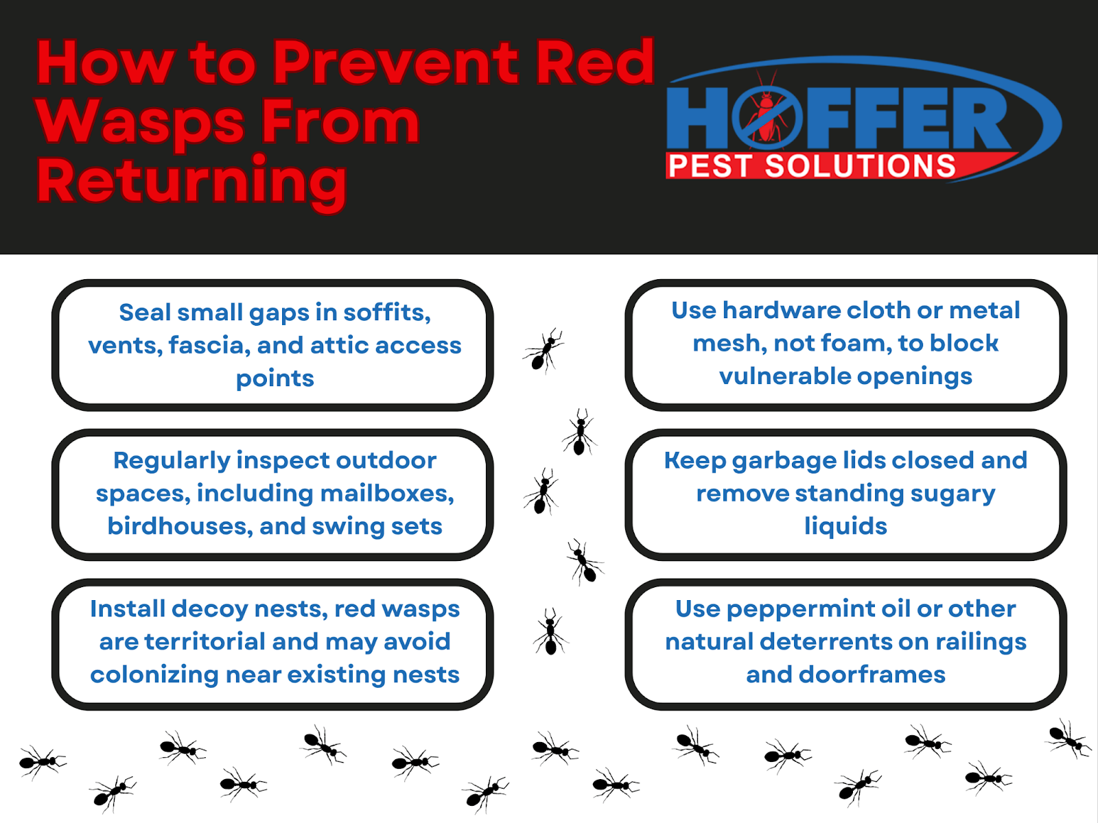 Even after successful removal, red wasps can return, especially if nesting sites aren’t modified. Prevention is required to keep your home protected year after year.