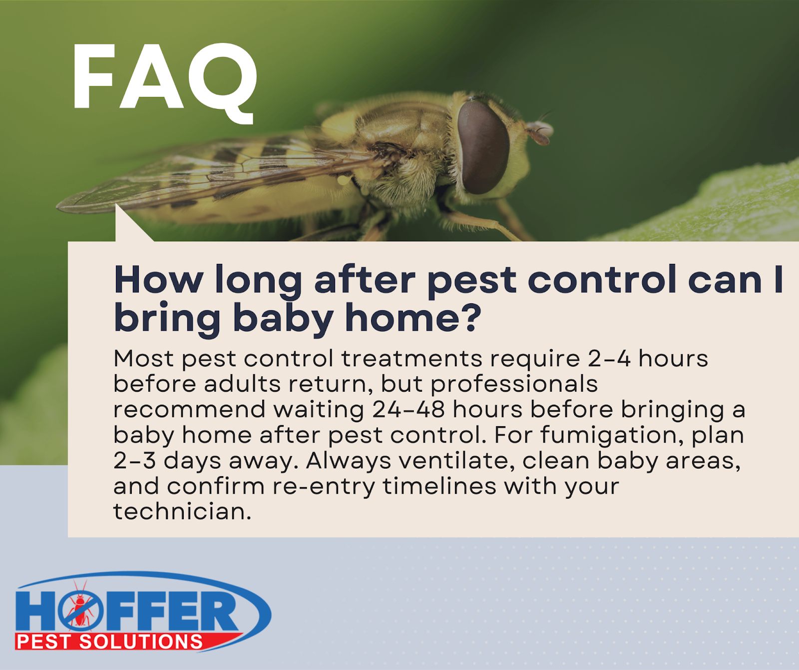 If you’re preparing your home for a newborn or worried about recent pest control treatments, call Hoffer Pest Solutions today. Our technicians will guide you through safe timelines, offer eco-friendly options, and make sure your home is both pest-free and baby-ready.