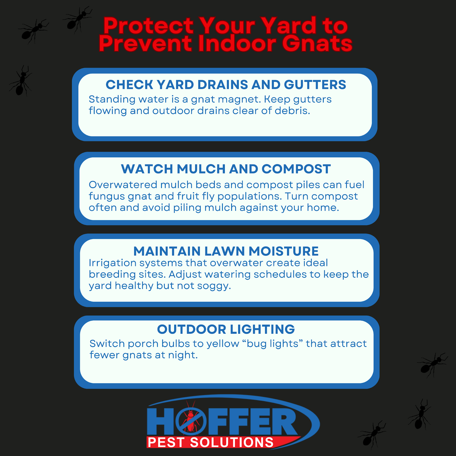 Check yard drains and gutters: Standing water is a gnat magnet. Keep gutters flowing and outdoor drains clear of debris.