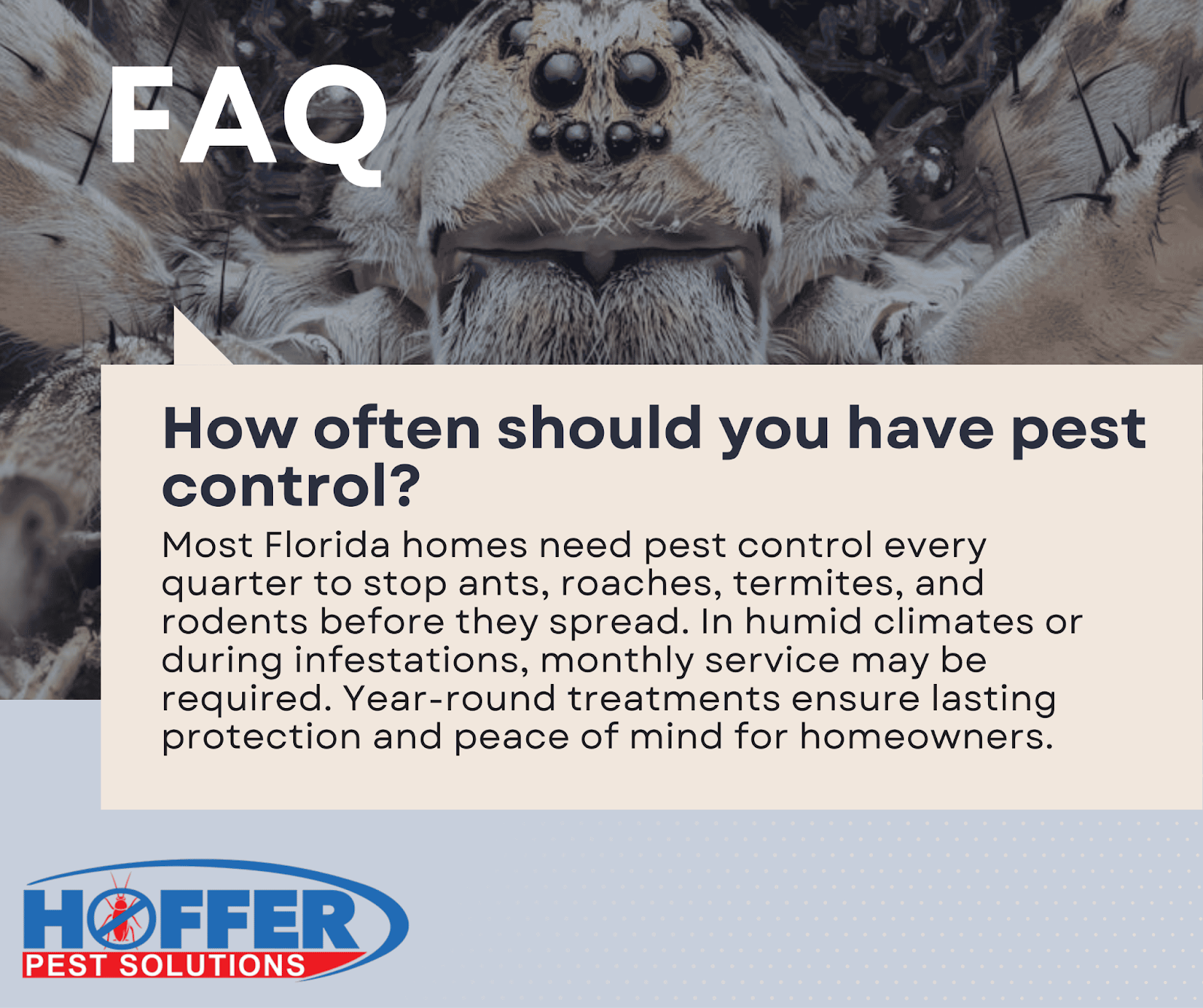 Most Florida homes need pest control every quarter to stop ants, roaches, termites, and rodents before they spread. In humid climates or during infestations, monthly service may be required. Year-round treatments ensure lasting protection and peace of mind for homeowners.