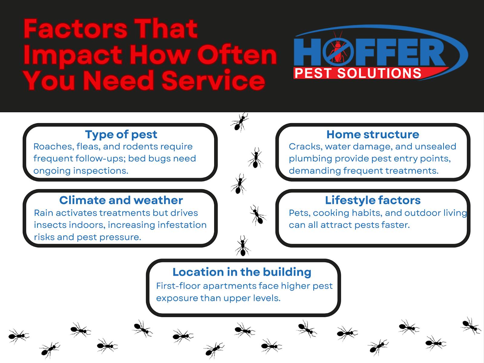 The right pest control frequency isn’t one-size-fits-all. Several factors determine your schedule: