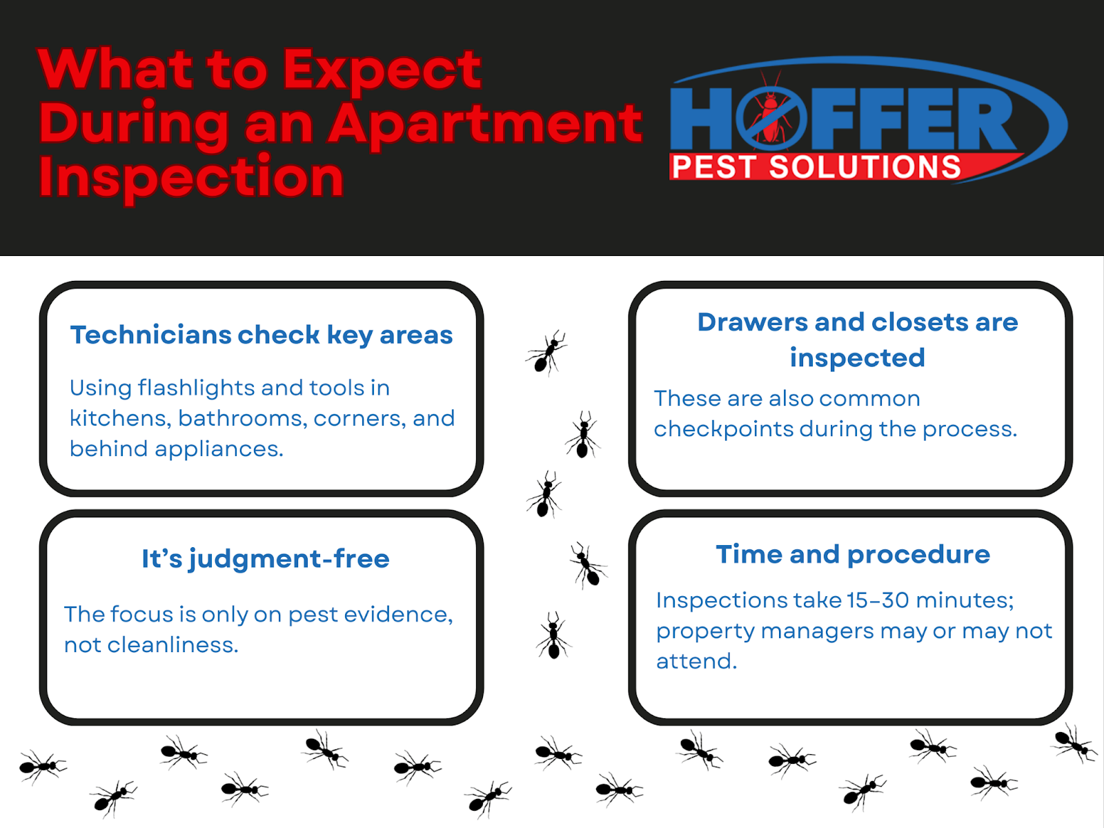 If you’ve never had pest control in your apartment before, the inspection can feel like a mystery. Here’s what actually happens: technicians use flashlights and inspection tools to check corners, bathrooms, and kitchens for signs of activity. Drawers, closets, and even behind large appliances are common checkpoints.