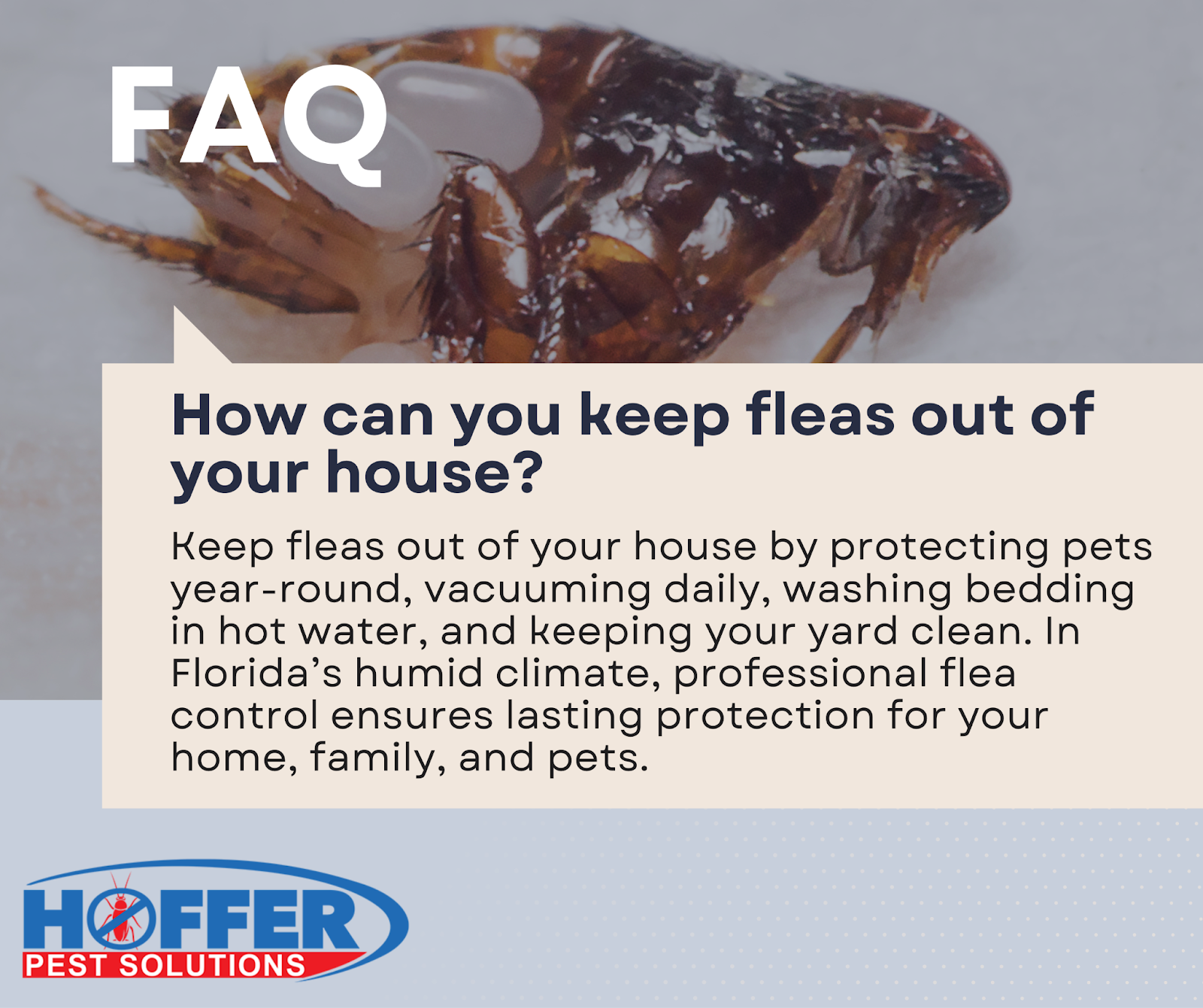 Keep fleas out of your house by protecting pets year-round, vacuuming daily, washing bedding in hot water, and keeping your yard clean. In Florida’s humid climate, professional flea control ensures lasting protection for your home, family, and pets.