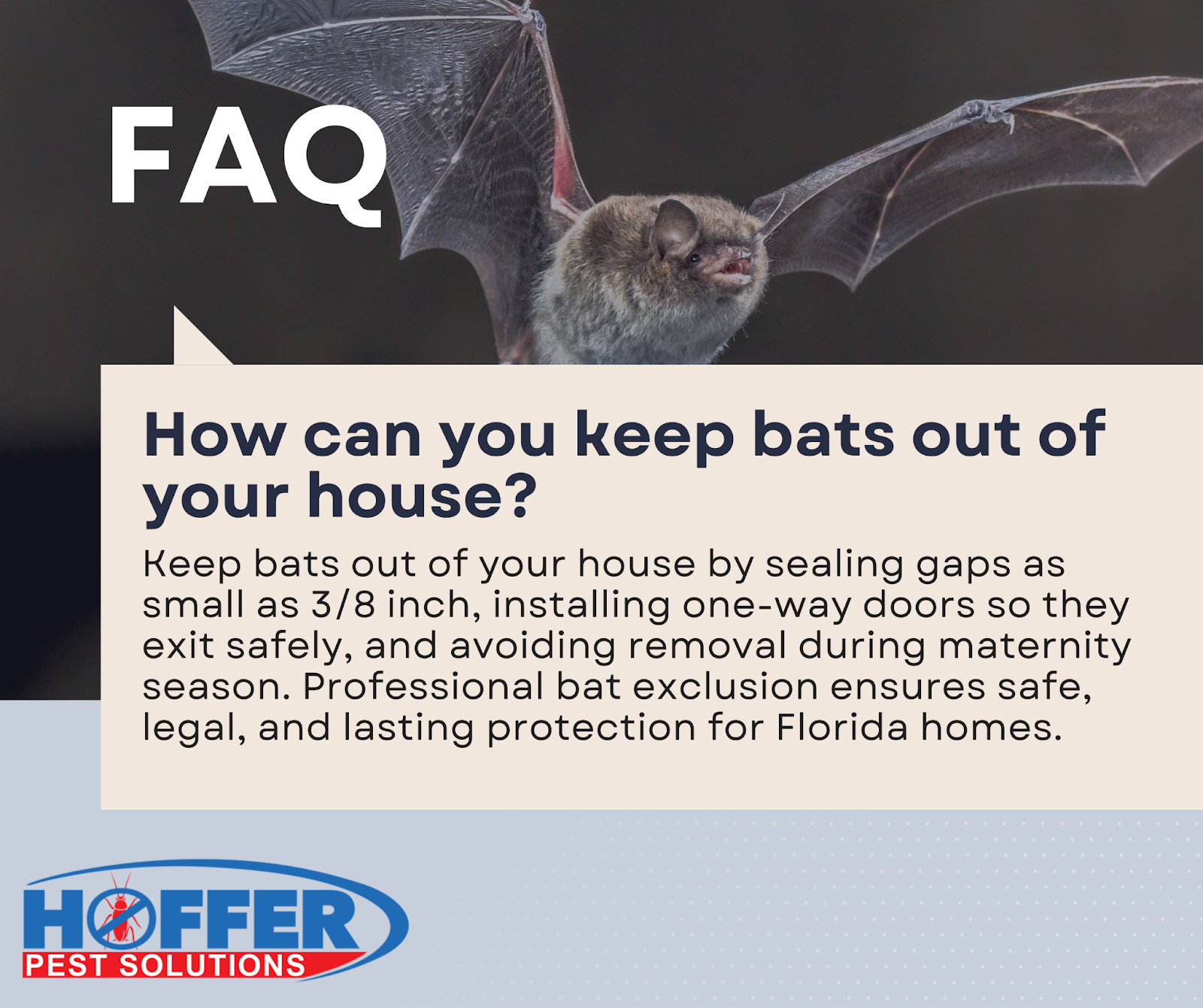Keep bats out of your house by sealing gaps as small as 3/8 inch, installing one-way doors so they exit safely, and avoiding removal during maternity season. Professional bat exclusion ensures safe, legal, and lasting protection for Florida homes.