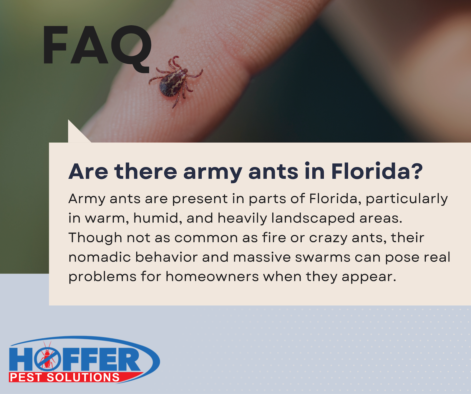 Army ants are present in parts of Florida, particularly in warm, humid, and heavily landscaped areas. Though not as common as fire or crazy ants, their nomadic behavior and massive swarms can pose real problems for homeowners when they appear.