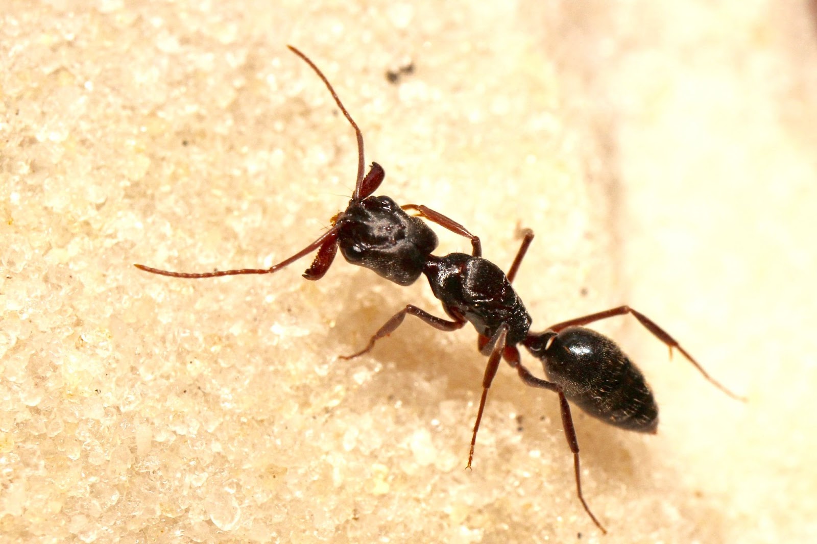 These long, curved jaws are visibly distinct from other ants and are held open at an aggressive angle until triggered. Body length also helps, most adults are about 0.5 inches long, significantly larger than common sugar ants or fire ants.