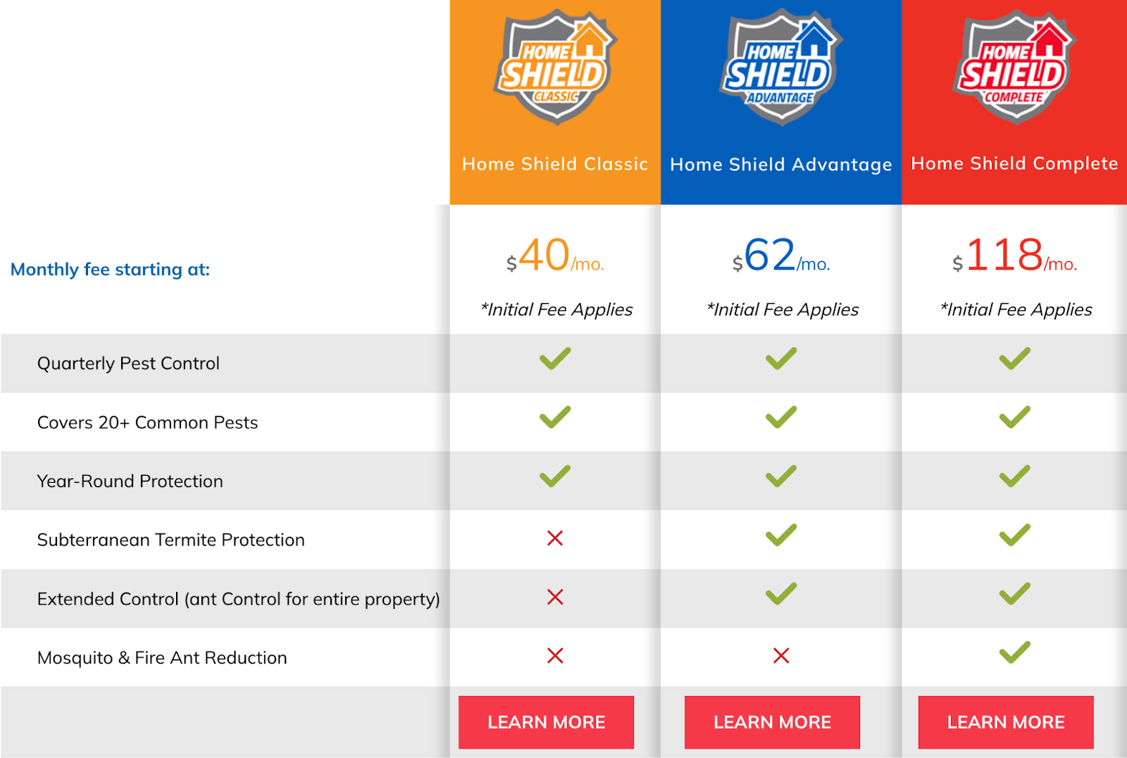 Premium Plans: Our Home Shield Complete is the all-in-one powerhouse. Starting at $118/month, you get protection from over 20 pests, Sentricon termite baiting, mosquito treatments, and even lawn pest protection, all backed by same-day service if you call before noon.